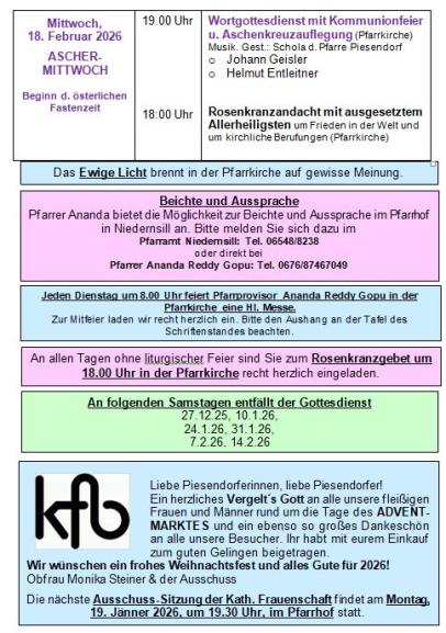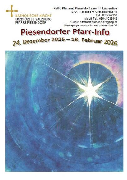 Die "Piesendorfer Pfarr-Info" erscheint alle 14 Tage neu, liegt an folgenden Orten zur freien Entnahme auf und ist auch hier abrufbar: