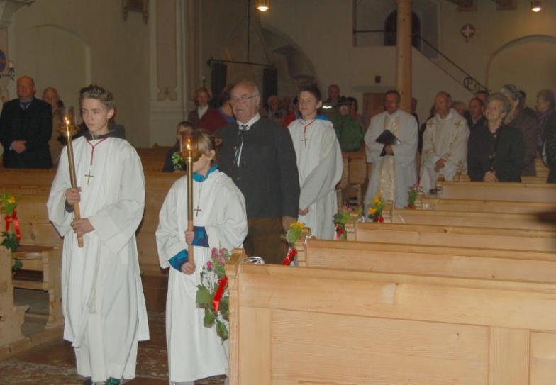 Voll Freude feiern wir jeweils am letzten Samstag im Oktober einen festlichen Gottesdienst mit unseren Ehejubelpaaren. Dazu leden wir alle Ehepaare ein, die im jeweiligen jahr 25, 40, 50 oder noch mehr Jahre verheiratet sind. Ein Bläserensemble unserer Trachtenmusikkapelle übernimmt die musikalische Gestaltung des Gottesdienstes, in dessen Mitte die Erneuerung des Eheversprechens steht. Nach dem Gottesdienst lädt die Pfarrgemeinde dann noch zu einem festlichen Abendessen in unserem Pfarrsaal ein. Da gibt es dann beim gemütlichen Beisammensein so etliche Anekdoten und Geschichten aus den vielen Ehejahren zu hören. Besonders freut es uns, dass auch unser Bürgermeister gern bei dieser Veranstaltung mit dabei ist. Gerade in Zeiten, in denen die Scheidungszahlen immer mehr steigen, sind uns unsere Ehejubelpaare große Vorbilder im gemeinsamen und guten Gestalten des menschlichen Lebens.