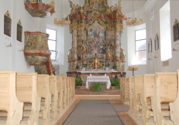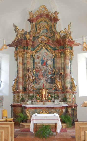 Das barocke Kircheninventar schufen einheimische Handwerker und Künstler im Jahr 1757. Im reich gegliederten Hochaltaraufbau zeigt das Altarbild die beiden Kirchenpatrone Bischof Ulrich von Augsburg und Königin Isabella (Elisabeth) von Portugal, darüber die von Engeln umgebene Muttergottes. Auf dem Auszugsbild sind Gottvater und der Heilige Geist dargestellt. Vor den Pilastern des Altaraufbaus stehen die Heiligenfiguren Bartholomäus und Matthias (mit dem Beil). Auf dem darüberliegenden, ausladenden Altargesims sind Voluten und Engel, im Auszug eine Rocaillebekrönung und Engel angebracht. Vergoldete Zierate befinden sich an den Füllungen der Postamente und dem Gebälk. |