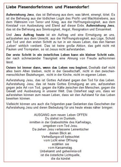 Die "Piesendorfer Pfarr-Info" erscheint alle 14 Tage neu, liegt an folgenden Orten zur freien Entnahme auf und ist auch hier abrufbar: